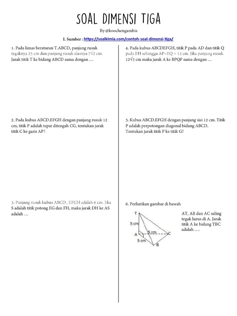 Kubus merupakan bangun ruang yang dibatasi oleh 6 bujur sangkar yang saling kongruen. Materi dimensi tiga mencakup tentang jarak, sudut pada bangun ruang. Dimensi tiga dalam matematika sanggup dibagi menjadi beberapa macam ibarat kubus, balok dan sebagainya. Kumpulan soal dimensi tiga yaitu jarak titik ke titik lengkap dan. Dari sinilah sanggup kita ketahui bahwa rumus dimensi .